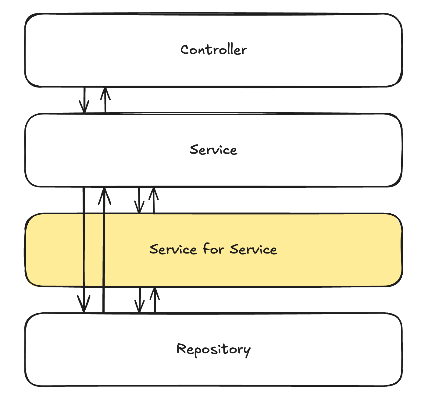 위 그림과 같은 구조도 고려를 했었다. 수직적 계층 구조를 유지하면서, 공통적인 기능을 따로 분리하기 위해 서비스끼리 의존하는 방법이 아닌, 서비스와 레포지터리 사이에 추가적인 계층을 추가하는 방식이다. 이 구조는 O'Reily Layered Architecture 아티클의 Open Layer 개념을 참고했다. 추가적인 계층을 뭐라고 명명하면 좋을지 모르겠다.. 아직도 고민 중이다. "공통 서비스", "서비스의 서비스"와 같이 이야기하면 이해하기 편할 것 같다. 기존의 서비스 계층은 API 요청/응답 DTO로 소통한다. 공통 서비스 계층은 컨트롤러와 직접 소통할 수 없다. 서비스 계층은 공통 서비스 계층을 의존할 수도 있고, 레포지터리 계층을 직접 의존할 수도 있다. 물론 이게 답이라는 것은 아니다. 그냥 하나의 아이디어?